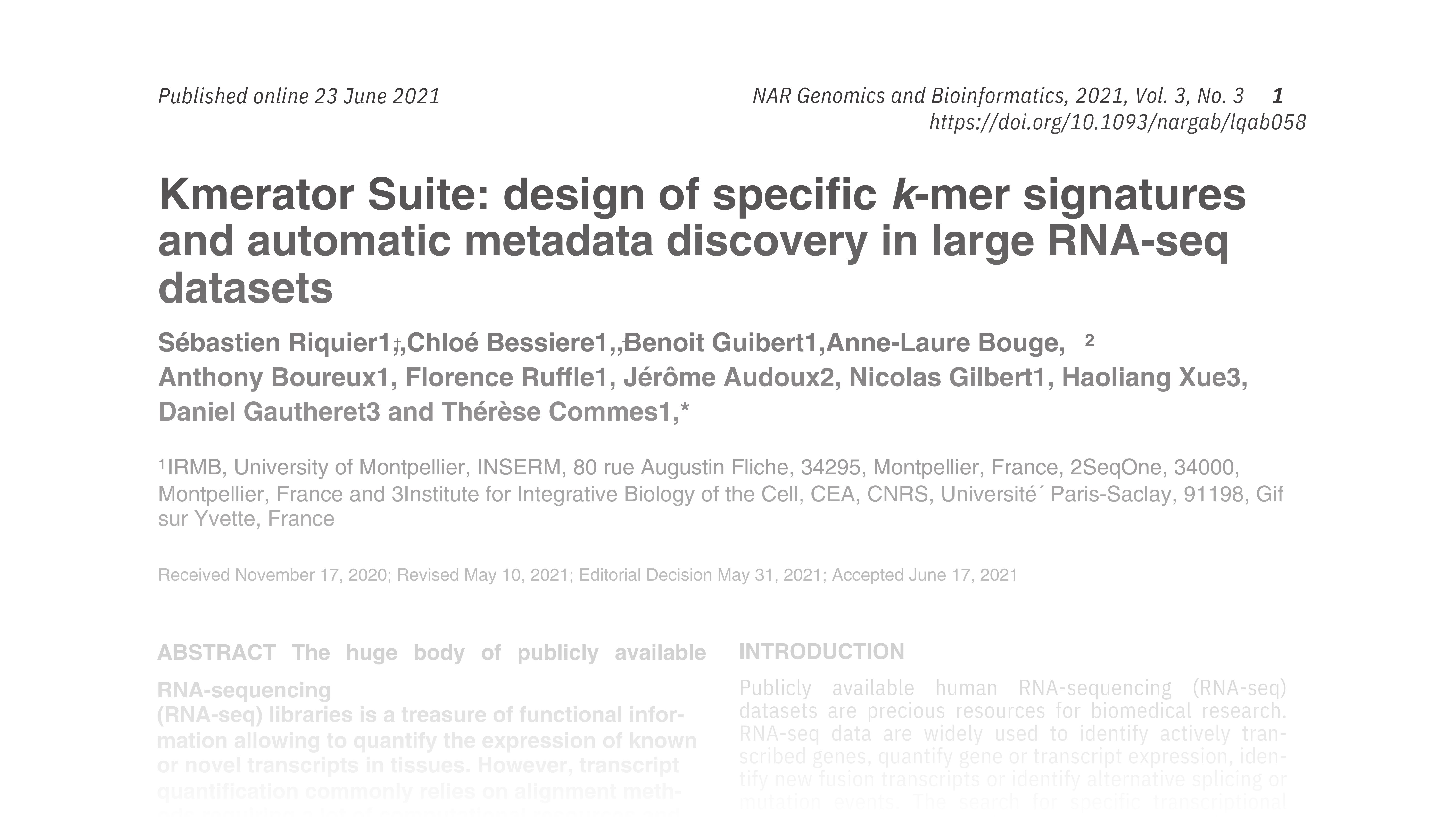 The huge body of publicly available RNA-sequencing (RNA-seq) libraries is a treasure of functional information allowing to quantify the expression of known or novel transcripts in tissues. However, transcript quantification commonly relies on alignment methods requiring a lot of computational resources and processing time, which does not scale easily to large datasets. K-mer decomposition constitutes a new way to process RNA-seq data for the identification of transcriptional signatures, as k-mers can be used to quantify accurately gene expression in a less resource-consuming way. We present the Kmerator Suite, a set of three tools designed to extract specific k-mer signatures, quantify these k-mers into RNA-seq datasets and quickly visualize large dataset characteristics. The core tool, Kmerator, produces specific k-mers for 97% of human genes, enabling the measure of gene expression with high accuracy in simulated datasets. KmerExploR, a direct application of Kmerator, uses a set of predictor gene-specific k-mers to infer metadata including library protocol, sample features or contaminations from RNA-seq datasets. KmerExploR results are visualized through a user-friendly interface. Moreover, we demonstrate that the Kmerator Suite can be used for advanced queries targeting known or new biomarkers such as mutations, gene fusions or long non-coding RNAs for human health applications.