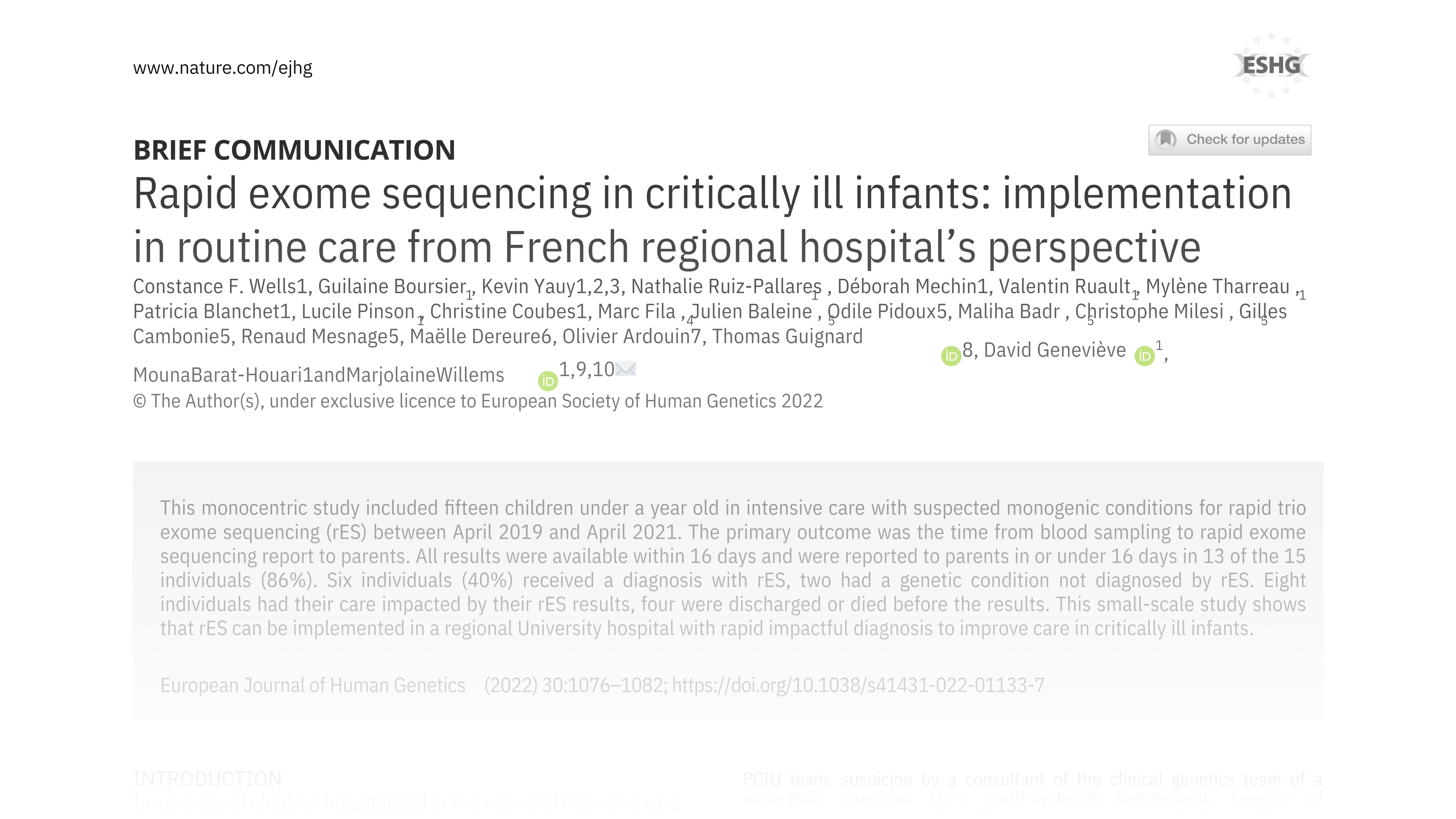 This monocentric study included fifteen children under a year old in intensive care with suspected monogenic conditions for rapid trio exome sequencing (rES) between April 2019 and April 2021. The primary outcome was the time from blood sampling to rapid exome sequencing report to parents. All results were available within 16 days and were reported to parents in or under 16 days in 13 of the 15 individuals (86%). Six individuals (40%) received a diagnosis with rES, two had a genetic condition not diagnosed by rES. Eight individuals had their care impacted by their rES results, four were discharged or died before the results. This small-scale study shows that rES can be implemented in a regional University hospital with rapid impactful diagnosis to improve care in critically ill infants.